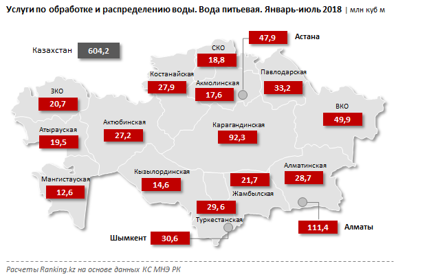 По итогам 7 месяцев водохозяйственные компании по стране обеспечили казахстанцам 604,2 миллиона кубометров питьевой воды - чуть меньше (на 1 процент), чем годом ранее.