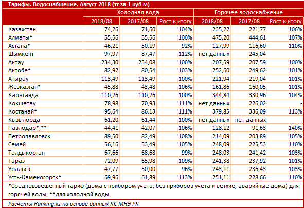 По итогам августа в среднем по Казахстану холодная вода обходилась жителям республики в 74,3 тенге за кубометр - это на 3,7 процента больше, чем годом ранее, передает Tengrinews.kz со ссылкой на исследование Ranking.kz.