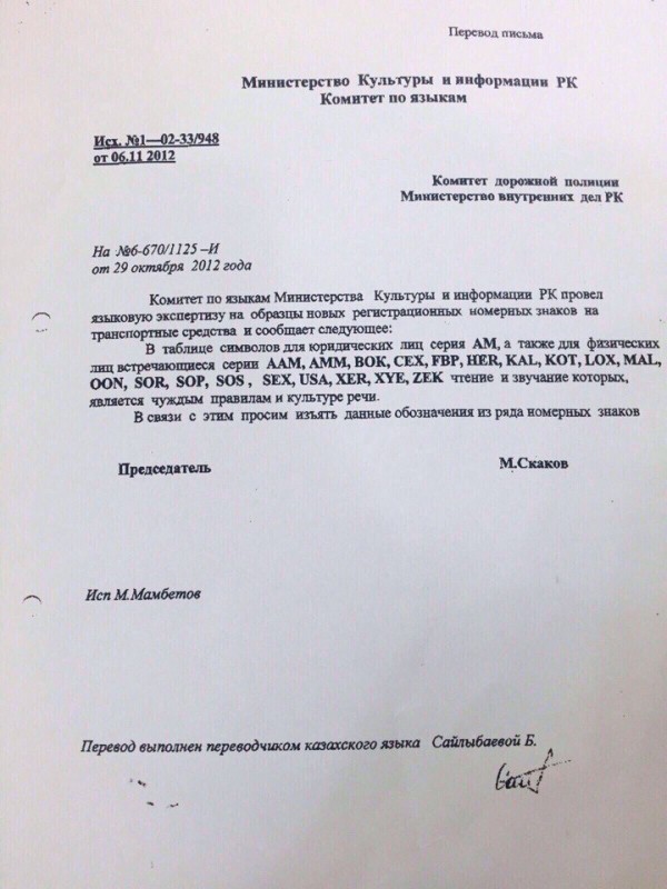 "Комитет по языкам Министерства культуры и информации РК провел языковую экспертизу на образцы новых регистрационных номерных знаков на транспортные средства и сообщает следующее: в таблице символов для юридических лиц серия АМ, а также для физических лиц встречающиеся серии ААМ, АММ, ВОК, СЕХ, FBР, НЕR, КАL, КОТ, LОХ, МАL, ООN, SOR, SOP, SOS, SEX, USA, XER, XYE, ZEK чтение и звучание которых являются чуждыми правилам и культуре речи. В связи с этим просим изъять данные обозначения из ряда номерных знаков", - говорится в письме. Документ датирован 2012 годом, однако ранее в Сети не публиковался.
