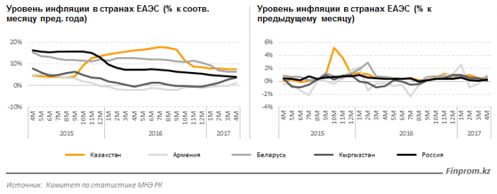 Самые низкие показатели инфляции - в соседнем Кыргызстане - 3,8 процента, и в Армении - всего 1,2 процента в апреле 2017 года в годовом выражении.