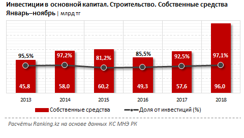 Если в среднем в инвестиционном портфеле Казахстана собственные средства бизнеса занимают 73 процента, то в строительном секторе их доля превышает 90 процентов. Это еще раз подчеркивает, что на текущий момент средства населения являются одним из основных источников фондирования для застройщиков.