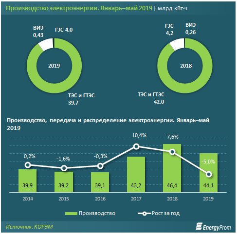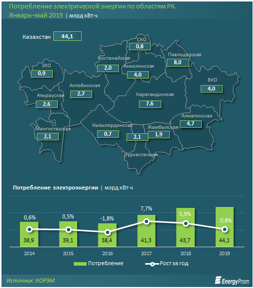 По данным КОРЭМ (Казахстанского оператора рынка электрической энергии и мощности), производство электроэнергии составило 44,1 миллиарда киловатт в час - на 5 процентов меньше, чем за аналогичный период годом ранее (46,4 миллиарда киловатт в час). Данные незначительно отличаются от данных Комитета по статистике МНЭ РК.