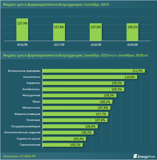 По данным Energyprom.kz, в сентябре 2019 года рост цен на лекарства за год достиг 8,2 процента, годом ранее показатель составлял 7 процентов. Заметнее всего подорожали витамины - на 11,4 процента за год, анальгетики - на 10,6, а также корвалол и антибиотики - на 9,3 процента.