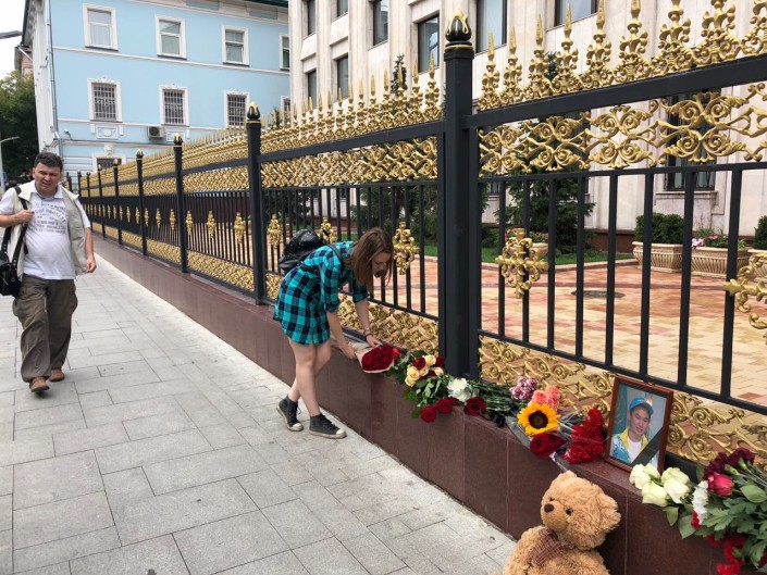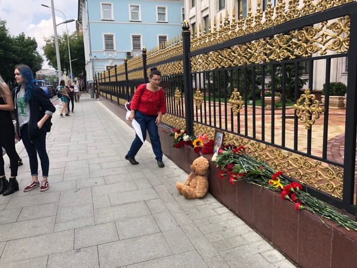 К зданию посольства Казахстана в Москве собираются люди, чтобы почтить память фигуриста Дениса Тена, погибшего от ножевого ранения 19 июля, сообщает РИА Новости.