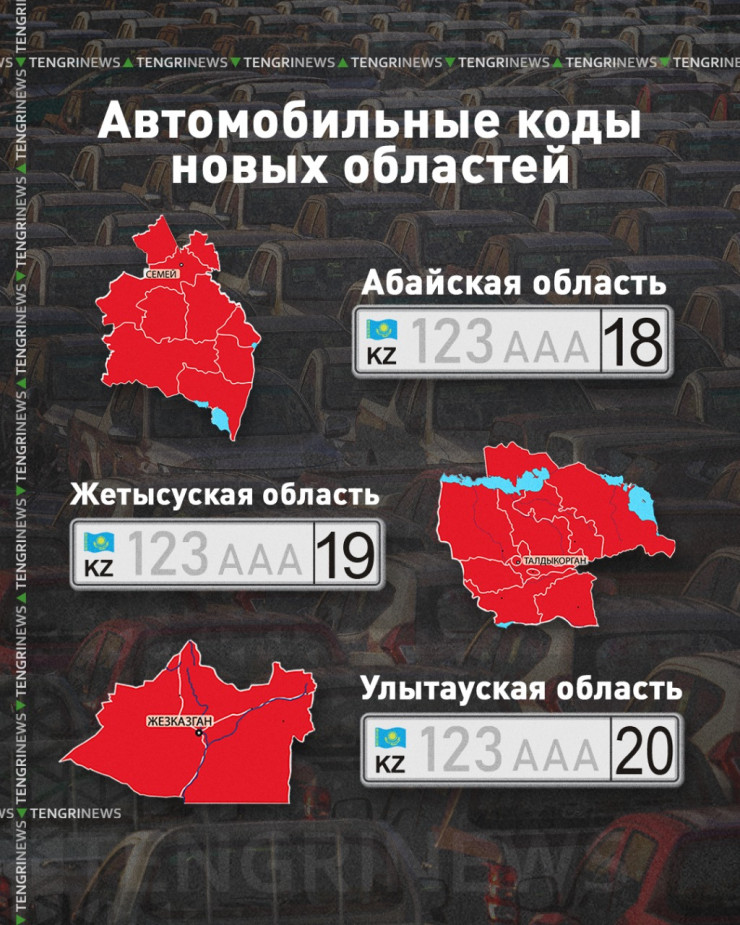 "Цифровое обозначение регионов на государственных регистрационных номерных знаках присваивается в зависимости от наименования региона на государственном языке в алфавитном порядке. В этой связи предлагается присвоение цифрового обозначения кодов регионов госномеров вновь образовавшимся трем областям - Абайской, Жетысуской и Улытауской - по аналогии в следующем порядке: Абайская область - 18, Жетысуская область - 19 и Улытауская область - 20", - прокомментировали в МВД.