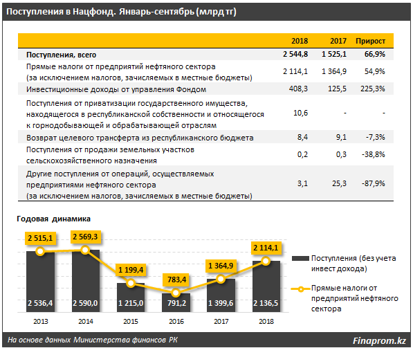 За 9 месяцев текущего года поступления в Нацфонд выросли на 66,9 процента и составили 2,5 триллиона тенге против 1,5 триллиона тенге для аналогичного периода годом ранее.