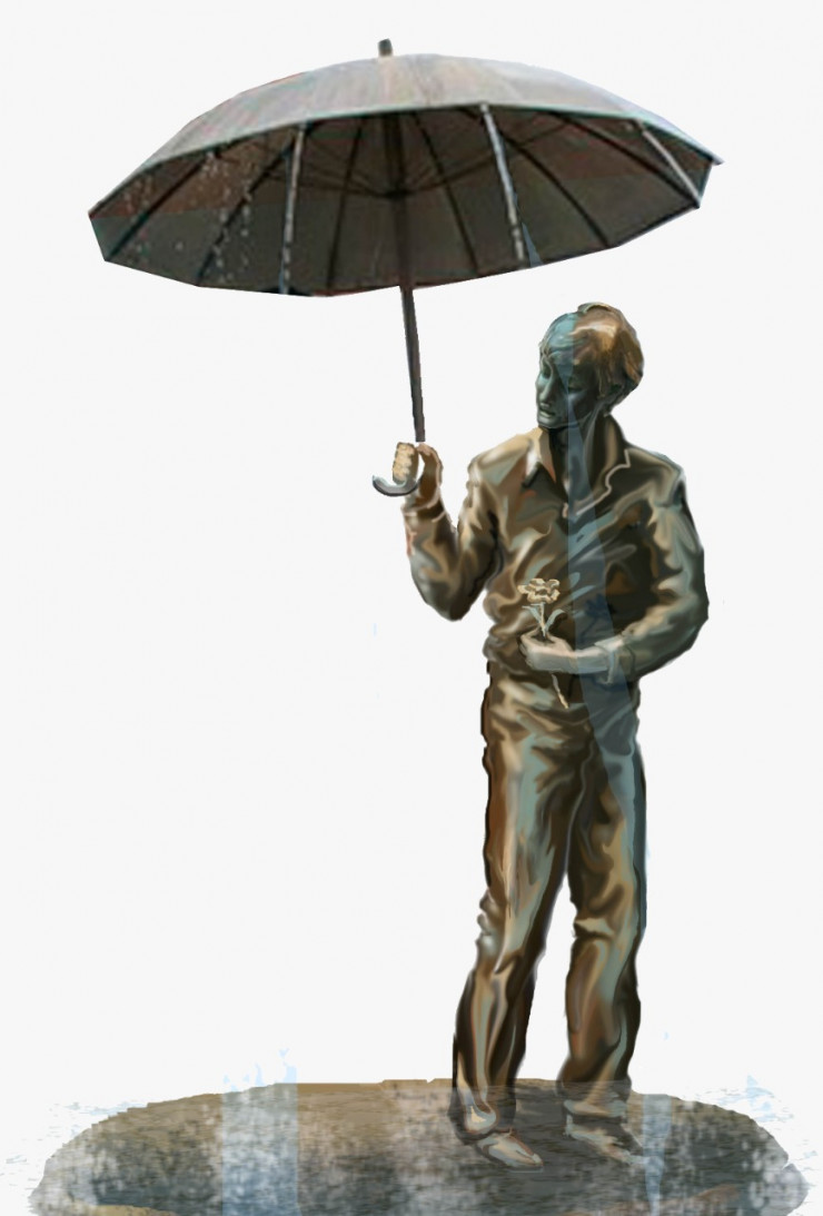 Символом "Места встречи" станет арт-скульптура - мужчина с цветами под зонтом. Вокруг скульптуры расположатся скамейки со столиками для отдыха, появится альпийская горка с ландшафтными кустарниками.