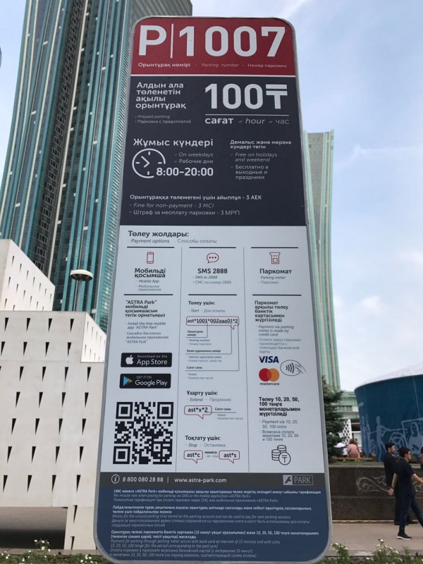 В Астане первый этап проекта "Управление парковочным пространством города Астаны" с 19 июня запущен в тестовом режиме на бульваре Нуржол. Пока оплата не взимается. В будущем стоимость платной парковки составит 100 тенге за час.