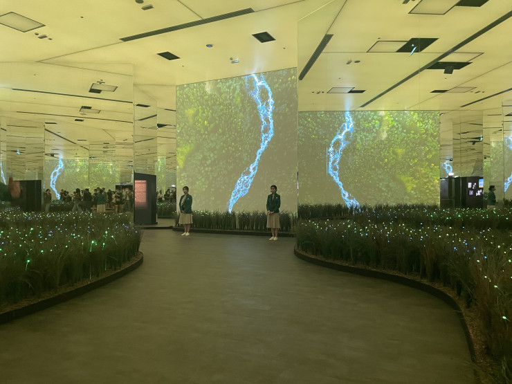 Внутри павильона посетителей встречает прохлада. Главный зал называется Зоной Великой степи. Здесь вместо стен зеркала и экраны. Они создают иллюзию бесконечного пространства, а вместе с оформлением из искусственной травы - вид бескрайней степи.