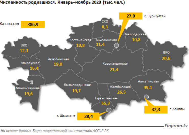 За январь - ноябрь 2020 года в Казахстане родились 386,9 тысячи человек, это на 5 процентов больше, чем годом ранее.