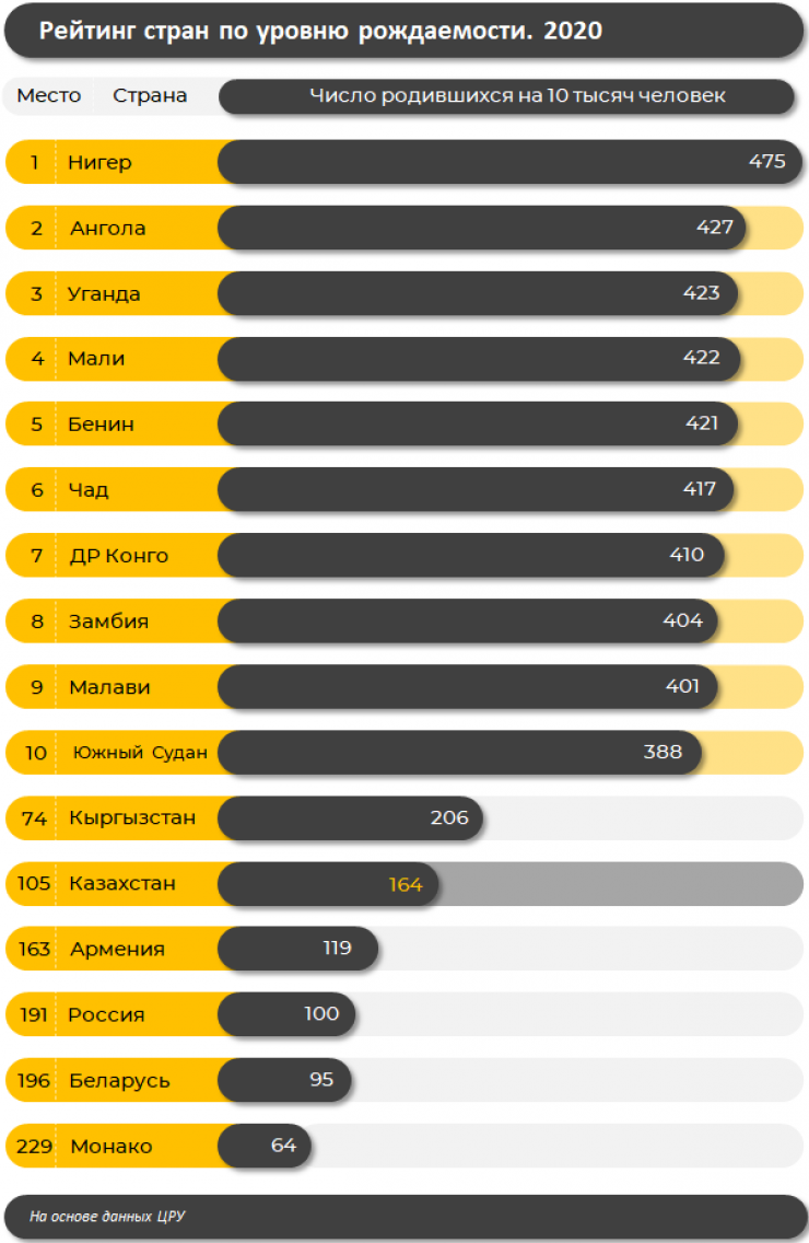 В рейтинге стран мира по уровню рождаемости, согласно данным ЦРУ, Казахстан занял 105-е место из 229. На 10 тысяч человек в Казахстане приходится в среднем 164 родившихся, передает Tengrinews.kz. Такие данные приводят аналитики Finprom.kz.