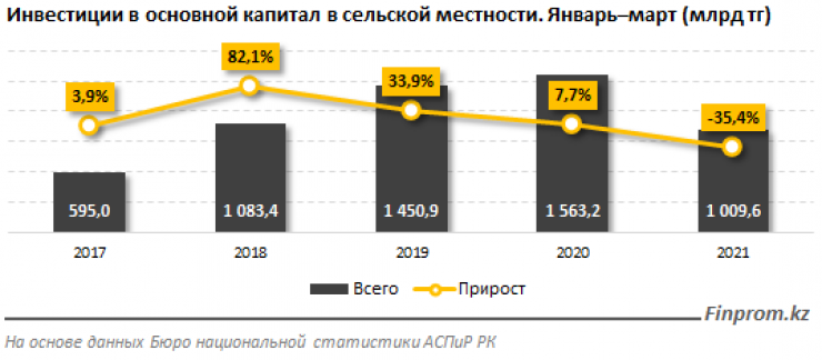 На каждого сельского жителя пришлось по 131 тысяче тенге капиталовложений за квартал против 202 тысяч годом ранее. За январь - март этого года инвестиции в основной капитал в сельской местности составили один триллион тенге - сразу на 35,4 процента меньше, чем годом ранее. Реальный спад составил 36,2 процента, передает Tengrinews.kz со ссылкой на Finprom.kz.