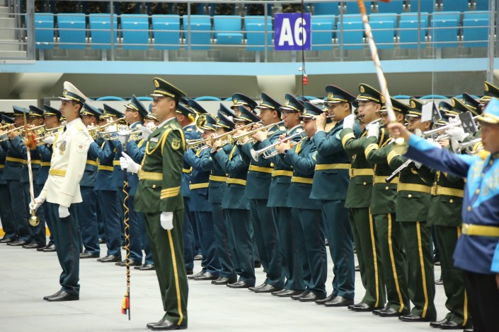 Здесь же, в Астане на  Ледовом дворце "Барыс арена" состоялось торжественное открытие VІI Международного военно-музыкального вестиваля военных оркестров "Әскери керней" на приз