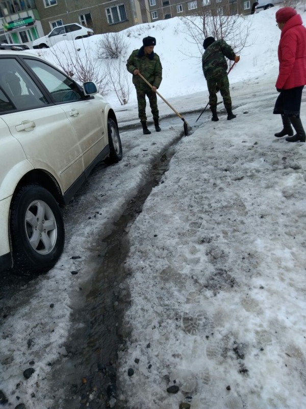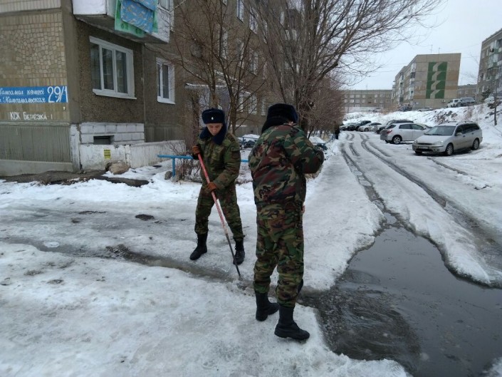 Уборку снега производят во дворах.