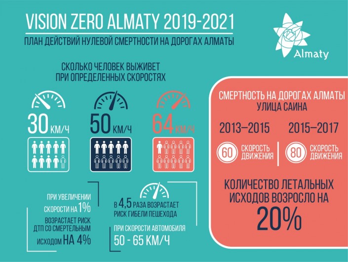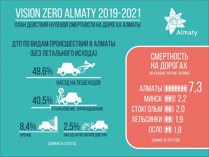 В Алматы разработан и утвержден План действий до 2021 года, направленный на повышение безопасности на дорогах и снижение случаев смертности при дорожно-транспортных происшествиях. Как подчеркивают в акимате, принятые меры позволили снизить количество ДТП с летальным исходом, однако статистика смертности на дорогах остается высокой. Так, за 2018 год на дорогах города погибли 133 человека, а 5 200 человек получили травмы. В связи с этим аким Алматы Бауыржан Байбек поручил Управлению городской мобильности разработать программу по снижению смертности и травматизма на дорогах с учетом лучших международных практик.