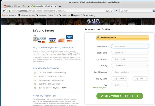 Для пользователей из Казахстана происходит редирект на сайт kazumedia.com, который выдает себя за портал с видеоконтентом. Для получения доступа ко всем видеозаписям на портале пользователю предлагают зарегистрироваться и верифицировать данные о кредитной карте.