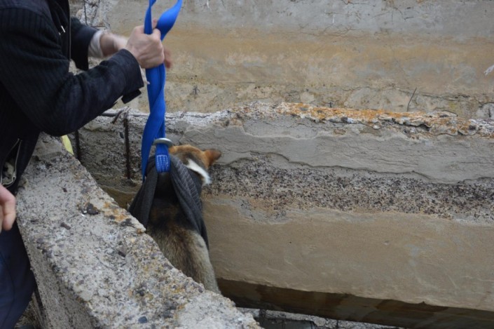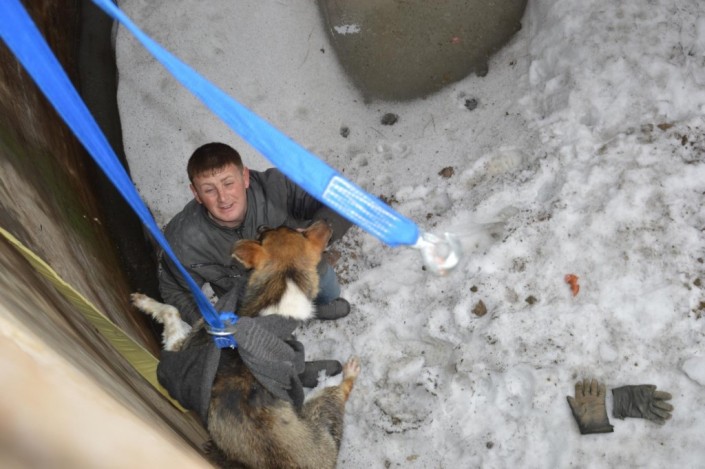 Волонтеры Юлия Головина и Елена Кочерга привлекли к спасательным работам своих супругов - 39-летнего Андрея Кочергу и 30-летнего Вячеслава Головина, которые обладают профессиональными навыками экстремального спасения. Вячеслав Головин, обвязавшись автомобильным тросом, спустился на глубину пяти метров. Страховал его спасатель Андрей. Опираясь на куски арматуры, парень спустился вниз и обвязал веревками напуганное животное, закутал его в кофту, и собаку осторожно подняли вверх.