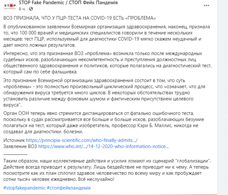 Фейковую информацию о том, что ВОЗ якобы признала наличие серьезного недостатка у ПЦР-тестов и поэтому этот метод не подходит для диагностики коронавируса, распространяют в Казнете, передает Tengrinews.kz со ссылкой на Stopfake.kz.