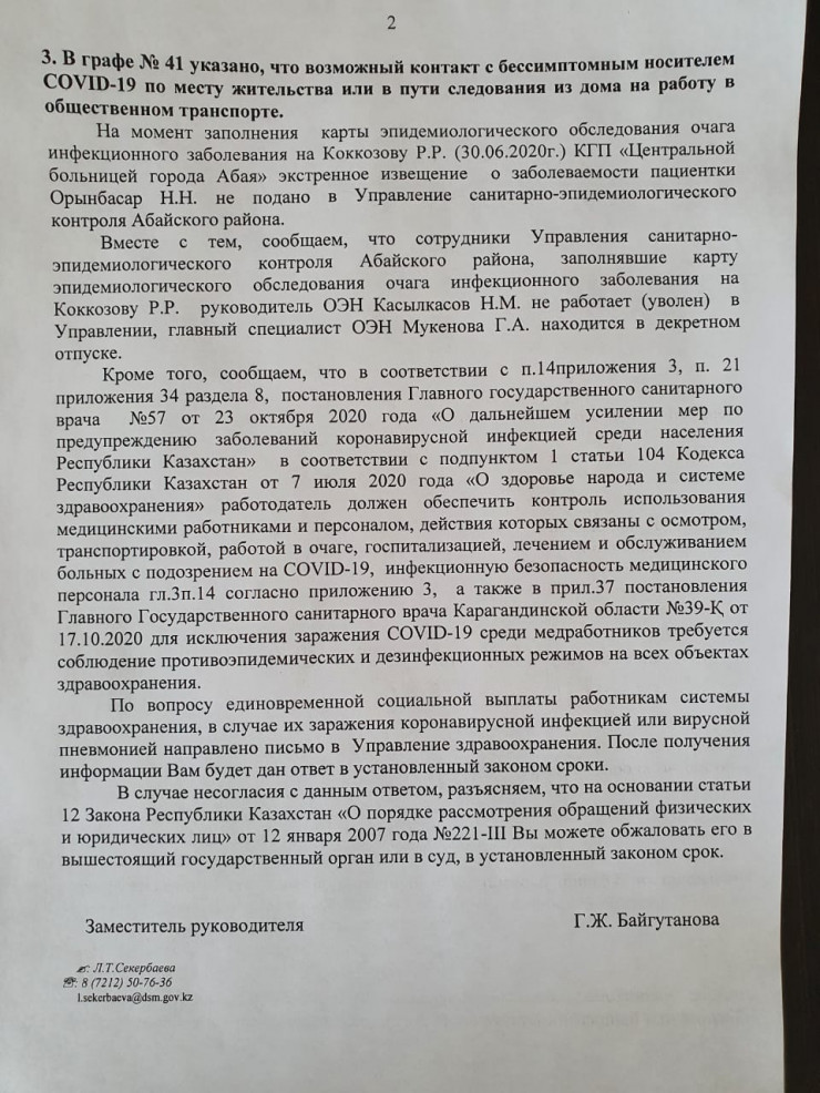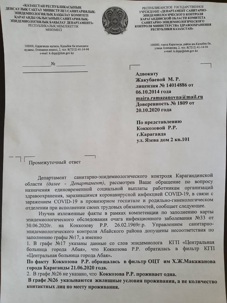 Стала разбираться и наткнулась на путаницу в документах. "Как мне объяснили, эпидемиологическая карта заполняется со слов заболевшего, - рассказывает Роза Коккозова. - Было записано якобы с моих слов, что я заразилась по дороге на работу или с работы или в условиях дома. Также указано, что анализ на COVID-19 я сдавала в больнице Абая, хотя я сдавала в Караганде. В СЭС обещали разобраться, но перестали поднимать телефон. Для меня важен даже не факт получения этих двух миллионов. Важно, справедливо ли относятся к медикам, врачам в данной ситуации. Мы работали и без этих двух миллионов. Я больше 25 лет в экстренной службе. После публикации в "Инстаграме" было очень много звонков от моих коллег, сокурсников, друзей, просто пациентов. Все ошарашены таким ведением дела".