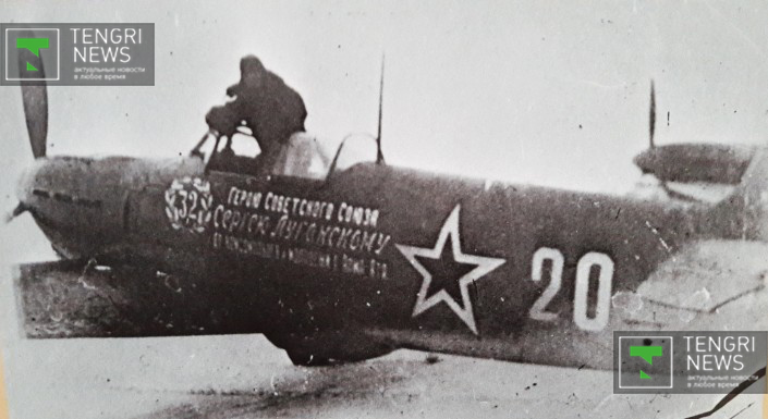 В 1943 году комсомольцы Алма-Аты подарили дважды Герою Советского Союза С. Луганскому самолет. Фото: Центральный государственный архив кинофотодокументов и звукозаписей РК.