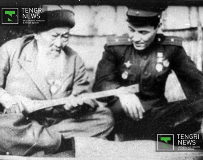 Сын казахского акына Жамбыла Жабаева погиб при освобождении города в Днепропетровской области. На фото: Герой Советского Союза Малик Габдуллин у акына в селе Узунагач Алма-Атинской области, 1943 год. Фото: Центральный государственный архив кинофотодокументов и звукозаписей РК.