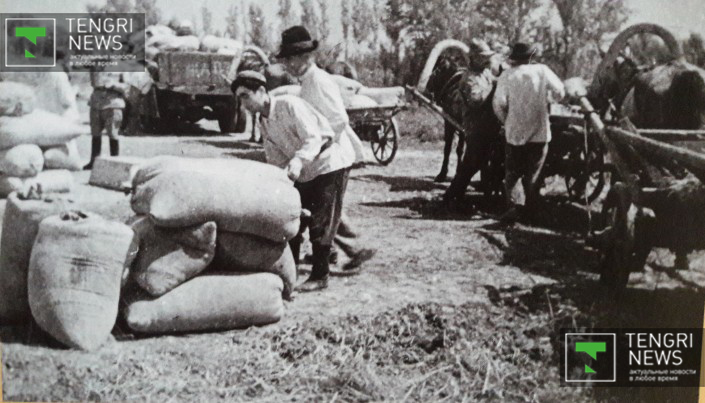 Сдача хлеба для фронта, Алма-Атинская область, 1941 год. Фото: Центральный государственный архив кинофотодокументов и звукозаписей РК.