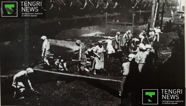 Женщины во время погрузки угля в вагоны. Ленгеруголь, Южно-Казахстанская область, 1941 год. Фото: Центральный государственный архив кинофотодокументов и звукозаписей РК.