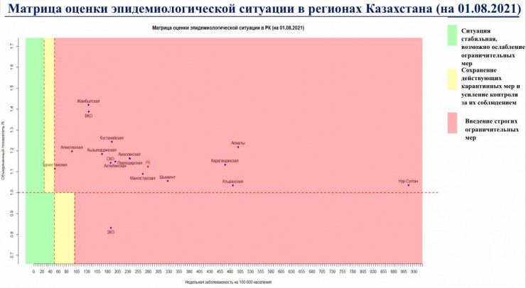 Все регионы Казахстана оказались в "красной" зоне по коронавирусу. Об этом свидетельствует матрица оценки эпидемиологической ситуации в регионах Казахстана на 1 августа 2021 года, передает корреспондент Tengrinews.kz.