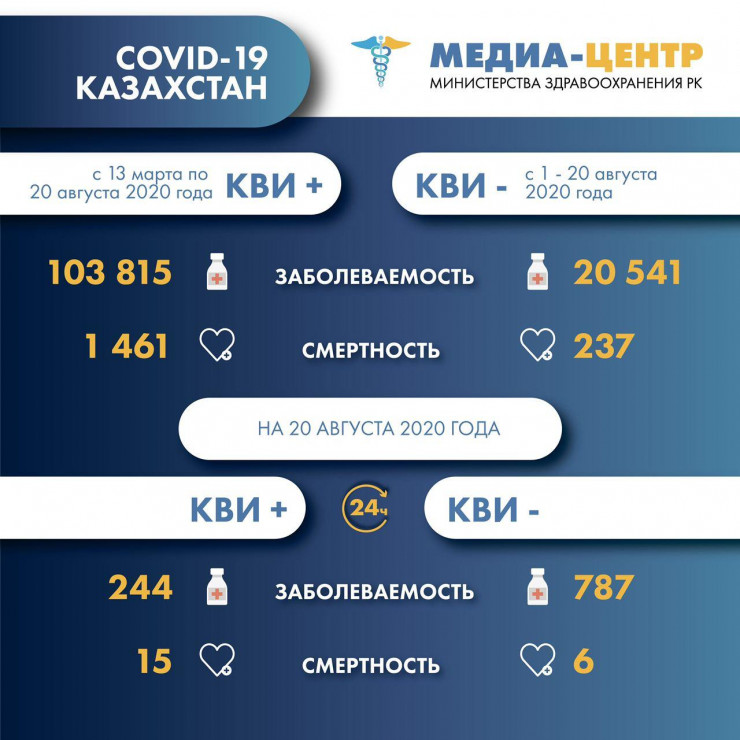 В Казахстане общее число заболевших коронавирусом выросло в стране до 103 815. Выздоровели 86 450 пациентов. Умерли 1461 человек.