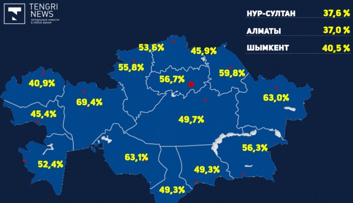 Самая низкая явка, по данным ЦИК на 16.00, в Алматы - 45,7 процента. Самая высокая - в Актюбинской области 79,7 процента. Подробнее тут.