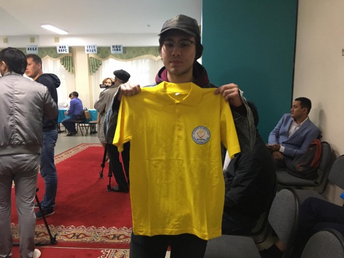 Это Абай. Ему 19 и это его первые выборы. В честь такого события парню вручили небольшой подарок.