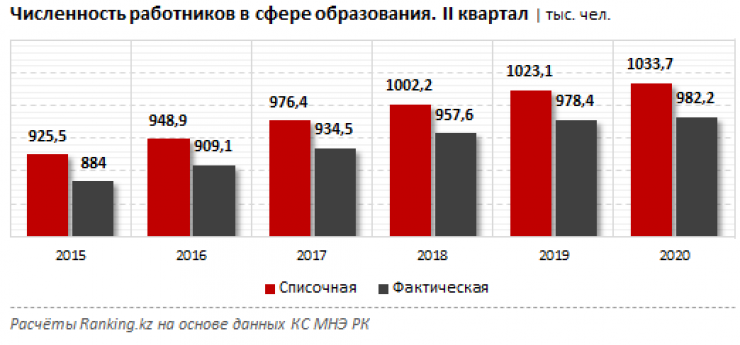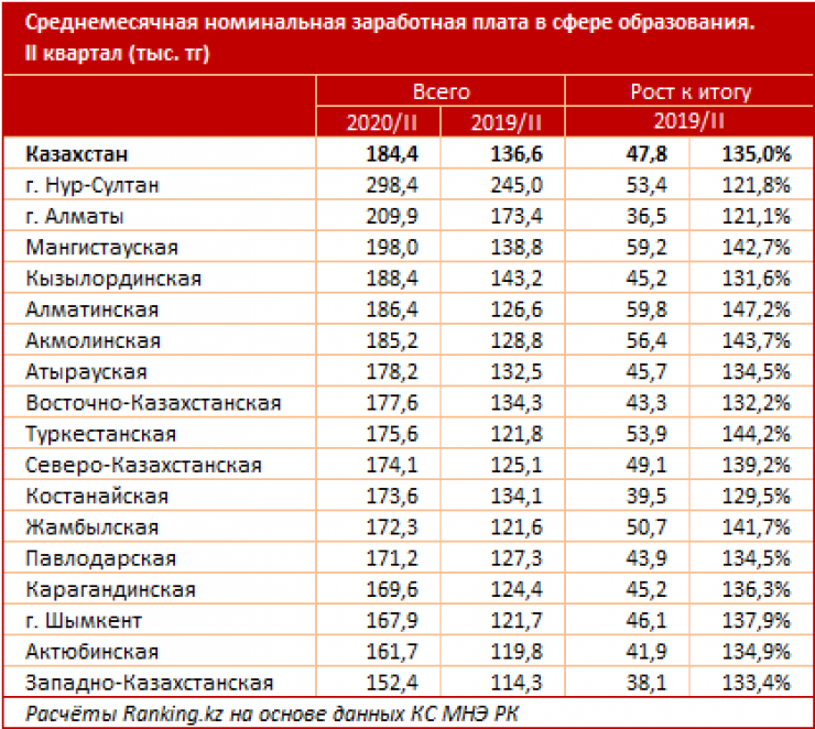 Во втором квартале 2020 года среднемесячная номинальная заработная плата работников в сфере образования достигла 184,4 тысячи тенге, это на 35 процентов больше, чем годом ранее. Реальный рост покупательной способности заработных плат в секторе с учетом инфляции составил 26,4 процента.