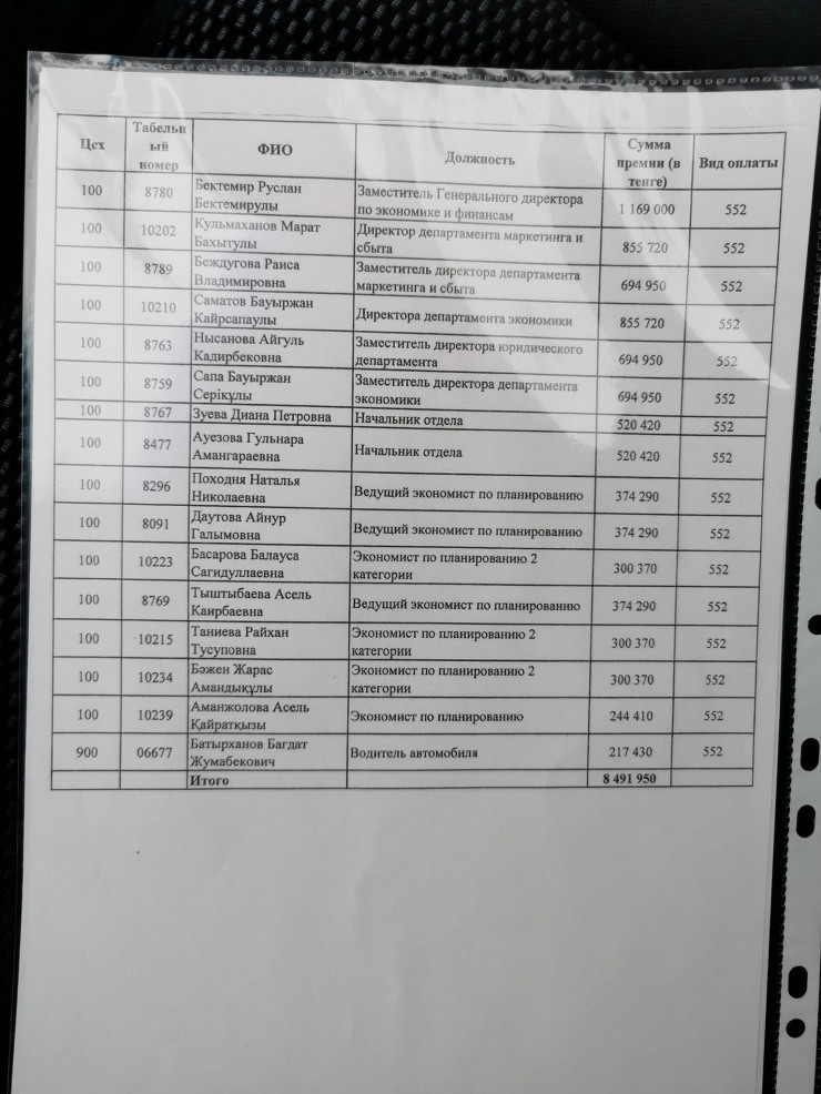 Напомним, председатель профсоюза YNTYMAQ Аскар Койшыбай опубликовал на своей странице в Facebook документ с суммами начислений премиальных выплат некоторым сотрудникам ТОО "МАЭК-Казатомпром" и обращение профсоюза к антикоррупционному департаменту Мангистауской области по поводу непропорционального начисления премий.