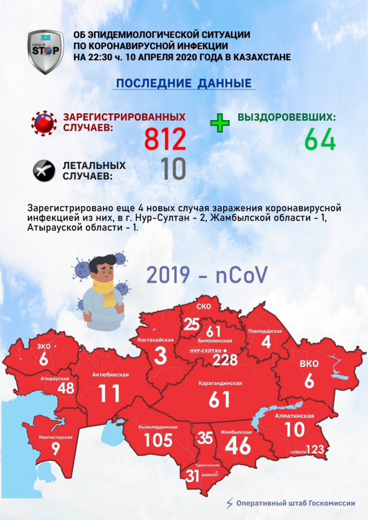 По состоянию на 22:30 10 апреля в Казахстане зарегистрировано еще 4 новых случая заражения коронавирусной инфекцией. Из них в Нур-Султане - 2, в Жамбылской области - 1, в Атырауской области - 1. Об этом сообщает оперативный штаб Госкомиссии Минздрава.