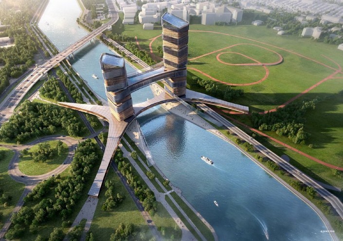 По замыслу авторов, одна башня символично расположится на правом берегу столицы, вторая - на левом, а посередине протянется конструкция длиной 100 метров со стеклянным полом, на которой посетители будут рассматривать проплывающие внизу пароходы, попивая кофе.