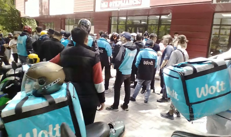 Курьеры-партнеры сервиса доставки Wolt заметили, что ряд учетных записей был заблокирован. Курьеры говорят, что заблокировано 40 человек. В этой связи работники 18 мая вновь собрались перед офисом компании в Алматы.