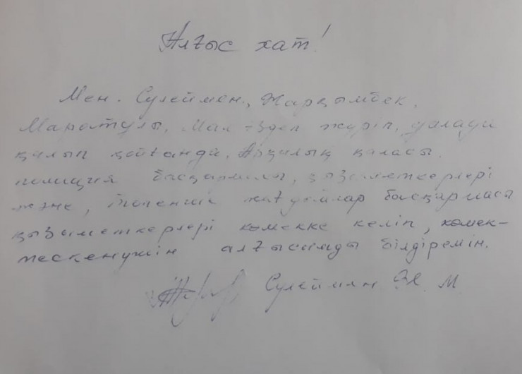 В адрес полицейских Жаркынбек Сулейман написал благодарственное письмо. В нем он благодарит аркалыкских сотрудников полиции Динмурата Едресова и Алишера Шигибаева, а также спасателей ДЧС.