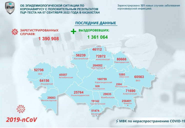 За прошедшие сутки, 7 сентября, в Казахстане зарегистрировали 321 нового зараженного коронавирусной инфекцией, передает Tengrinews.kz со ссылкой на данные Межведомственной комиссии по нераспространению COVID-19.