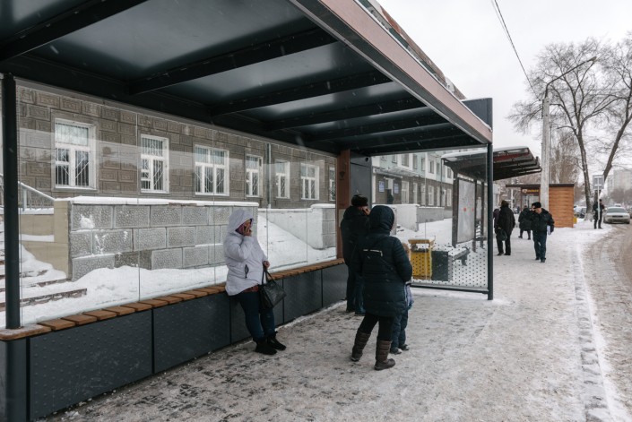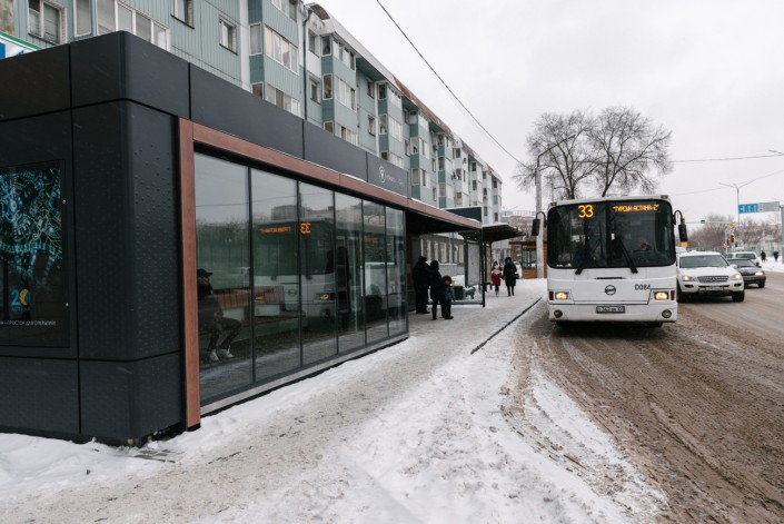 Конструкции остановок выполнены из стальных гнутых металлических профилей, обшивка каркаса - из алюминиевых панелей с полимерным антивандальным покрытием из минерального каленого стекла. Весь комплекс покрыли автолином - это специальный антискользящий линолеум, он долго не истирается, борется с оледенением и не впитывает влагу и запахи.