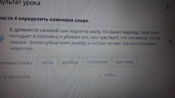 "Определи в тексте четыре основных слова. Давным-давно сын хана отправился на охоту. Он ранил одного кулана. Кулан лягнул охотника и убил его. Хан почувствовал что-то неладное. Куйши взял в руки домбру и начал играть. Хан понял все через музыку", - говорится в варианте на казахском языке.