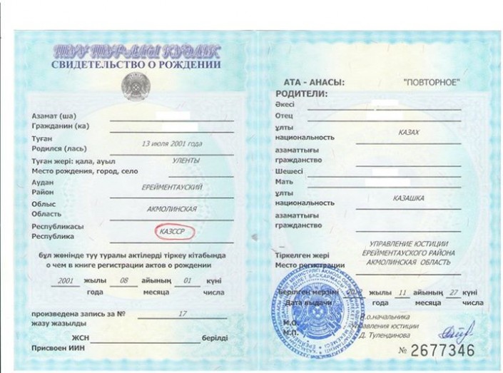 Скан документа в Facebook выложил пользователь Улан Хоршатулы. Согласно данным из свидетельства, девочка родилась в Ерейментауском районе в селе Уленты 13 июля 2001 года. На документе стоит печать и подпись и.о. начальника управления юстиции Д. Тулендиновой.