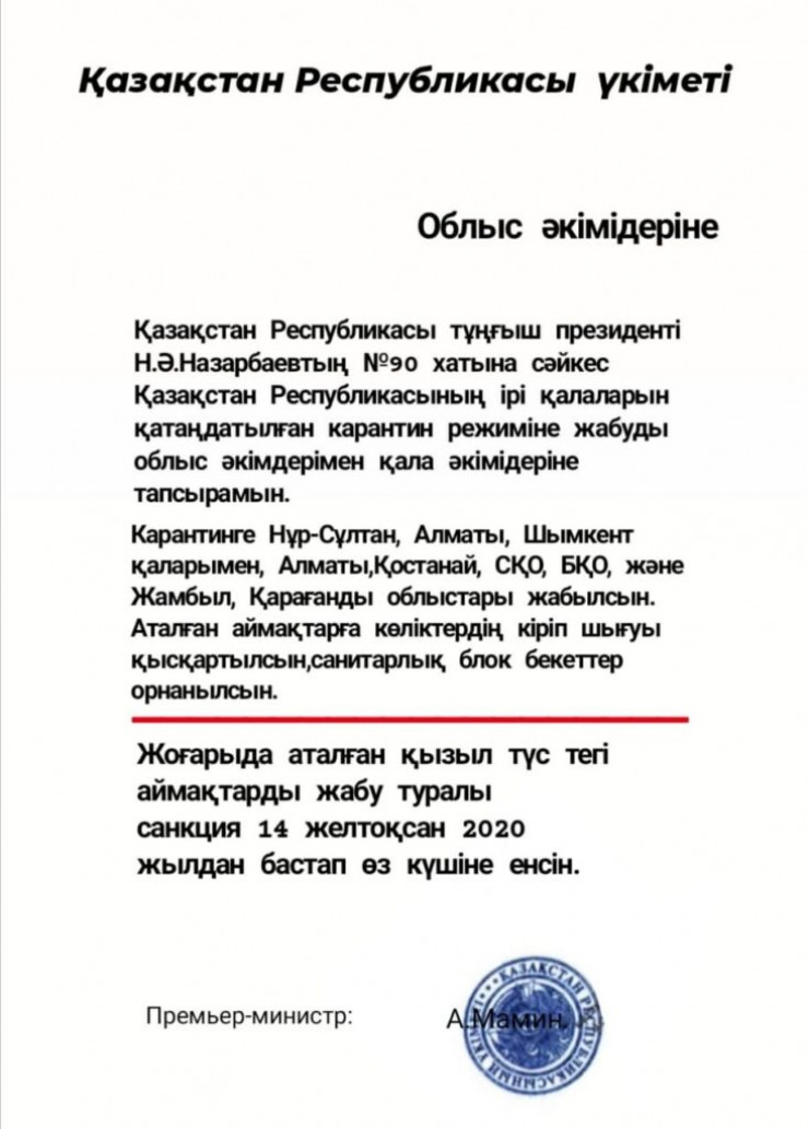"Данное сообщение не соответствует действительности. Фотография документа о закрытии регионов является фейком. В регионах и городах Казахстана не планируется вводить строгий локдаун с установкой блокпостов и ограничением движения с 14 декабря. Призываем казахстанцев доверять только информации из официальных источников", - сказано в заявлении пресс-службы.