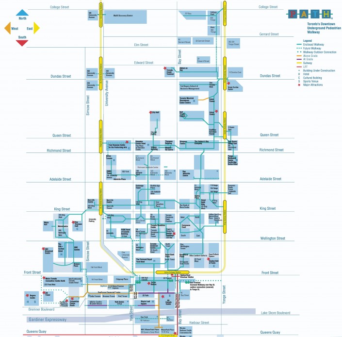 Часто работники делового центра Торонто в селятся в квартирных комплексах прямо над станциями метро. Тем самым они экономят не только на автомобиле, но и на верхней зимней одежде. В холодное время года PATH позволяет не выходить на улицу.
