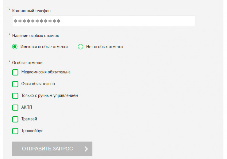 8. Уточните свой номер телефона и наличие в правах особых отметок - если вы носите очки, к примеру. После чего нажимайте на кнопку "Отправить запрос".
