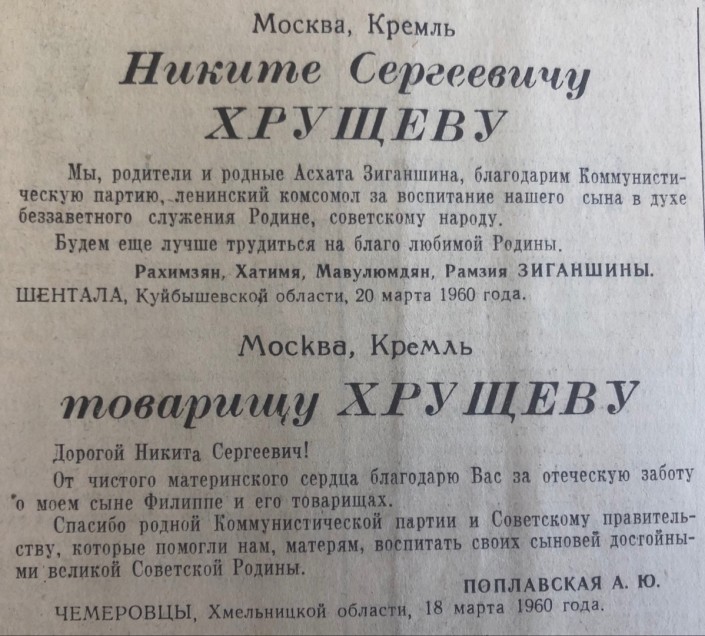 22 марта 1960 года, вторник. На первой странице "Казахстанской правды" - письма читателей с благодарностями в адрес Никиты Хрущева. В это время он занимал пост первого секретаря ЦК КПСС и председателя Совета Министров СССР.