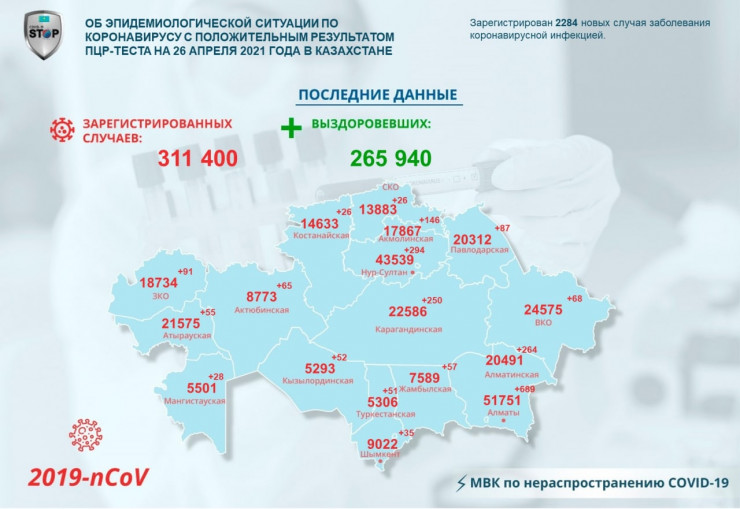 За прошедшие сутки (по данным на 26 апреля) в Казахстане зарегистрировано 2284 новых случая заболевания коронавирусной инфекцией, передает Tengrinews.kz со ссылкой на МВК по нераспространению COVID-19.