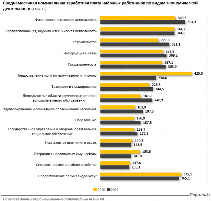 По видам экономической деятельности самые высокие среднемесячные зарплаты у работников сферы финансовой и страховой деятельности: 394,3 тысячи тенге. Также немало зарабатывают сотрудники профессиональной, научной и технической сферы деятельности (344,6 тысячи тенге ) и строительства (321,1 тысячи тенге ).