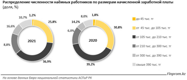 Доля сотрудников, получающих заработную плату менее 45 тысяч тенге, согласно апрельскому обследованию Бюро национальной статистики АСПиР, сократилась за год с 1,8 процента до 1,2 процента от общей численности наемных работников. Более четверти работников получают от 45 тысяч до 105 тысяч тенге. Самая многочисленная группа, или 36,9 процента - сотрудники, получающие заработную плату от 105 тысяч до 210 тысяч тенге.
