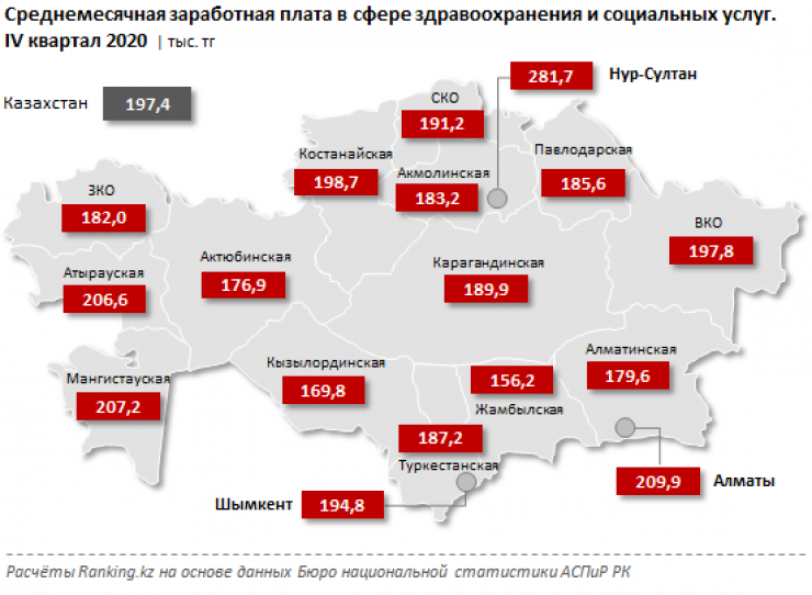 "Пока же заработные платы в сфере здравоохранения и социальных услуг в разрезе регионов варьируются от 156,2 тысячи тенге в Жамбылской области до 281,7 тысячи тенге в Нур-Султане. Высоки также зарплаты в Алматы (209,9 тысячи тенге) и Мангистауской области (207,2 тысячи тенге)", - добавляет издание.