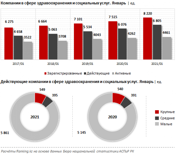 Сообщается, что в январе 2021 года в Казахстане было зарегистрировано 8,2 тысячи компаний (плюс 9,4 процента за год) в сфере здравоохранения и социальных услуг, из них действующие - 6,8 тысячи (плюс 12 процентов за год).
